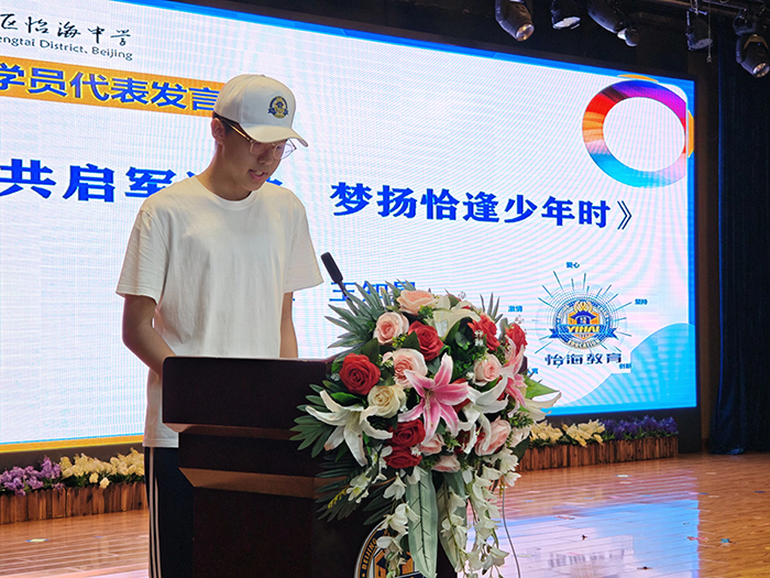参训学员代表高一2班王知昱在发言中回顾了军训历程,分享蜕变感悟,从“娇气散漫”到“自律坚强”,军训不仅锤炼体魄,更塑造意志。